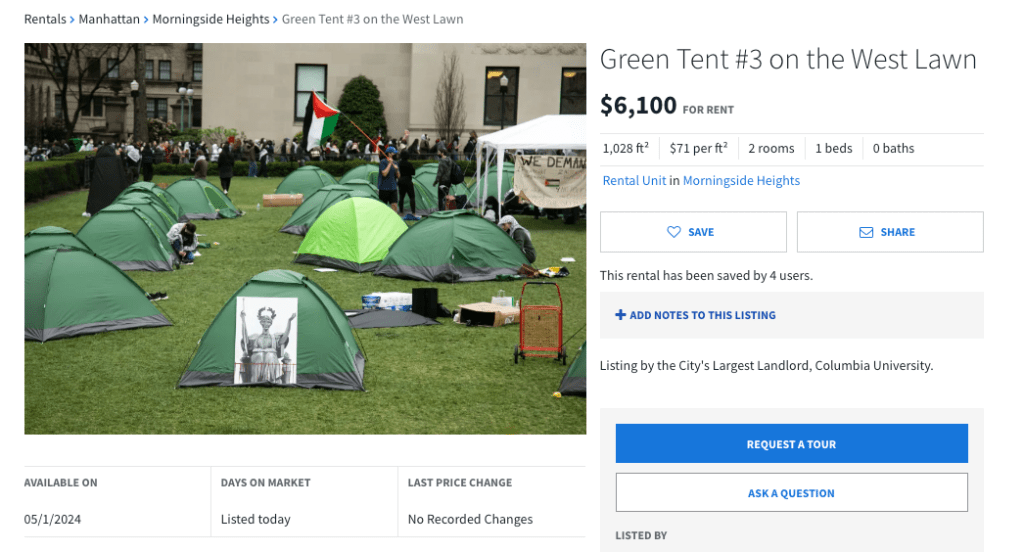 HARLEM — Columbia University has listed the protesting encampment on Streeteasy. Students sleeping inside their tents woke up to realtors unzipping the shelters to give prospective tenants tours.